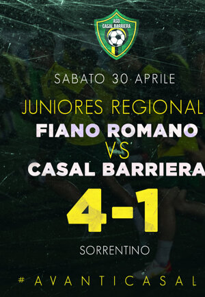 Al Nicolino Usai un Casal Barriera tosto e determinato batte meritatamente il Fiano Romano per 2 a 1.Il Casale gioca un grande primo tempo nel quale segna due gol con Sorrentino (altrettanti sono stati annullati in maniera troppo severa dal giudice di gara) con un gran bel calcio di punizione e un tiro dal dischetto, non concedendo nulla ai ragazzi del Fiano Romano.